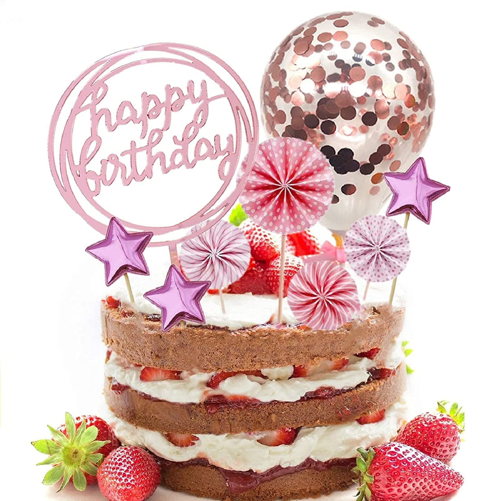 Amazon Com 11 Pack Rose Birthday Cake Topper Set Acrylic Happy Birthday Cake Toppers Cupcake Toppers Paper Fans Confetti Balloon Stars Birthday Decorations For Children Or Adults Grocery Gourmet Food